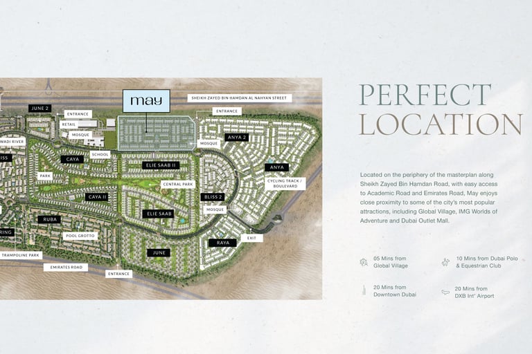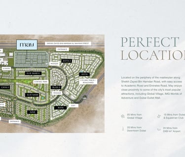 May Townhouses is nestled in the heart of the tranquil Arabian Ranches III community, one of Dubai's most sought-after residential areas. Located off Sheikh Mohammed Bin Zayed Road, this prime location offers easy access to the city's main destinations.